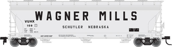 Atlas 20003478 ACF 4650 Centerflow Covered Hopper Post-1971 Version - Wagner Mills VUHX #110 (gray, black billboard Lettering) HO Scale is backordered and will ship as soon as it is back in stock.