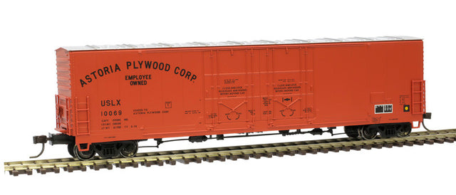 Atlas 20006774 USLX - Astoria Plywood #10069 (orange, black) Evans 53' Double Plug-Door Boxcar HO Scale - Picture may show a different road number.
