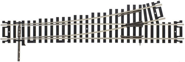 This Atlas Code 100 Custom-Line Mark V Turnout features nickel silver rail and black plastic ties that match other Atlas Code 100 trackage. This turnout can be set up as a remote or manual switch with your choice of Atlas switch machines (sold separately). The turnout comes equipped with a metal frog, complete with a conveniently placed power lug so you can avoid soldering underneath the turnout should you choose to power the frog. Turnout points are also made of cast metal. A scale-sized throw bar with the extension on the straight stock rail side, as well as separately molded frog guard rails are molded in a realistic metal color. Custom Line turnouts feature Code 100 low-oxidation nickel silver rail with a realistic cross-section and scale-sized molded spike heads for realism. For track planning purposes Code 100 Custom-Line Mark V Turnouts are not interchangeable with Atlas Snap Switch turnouts in layout plans.