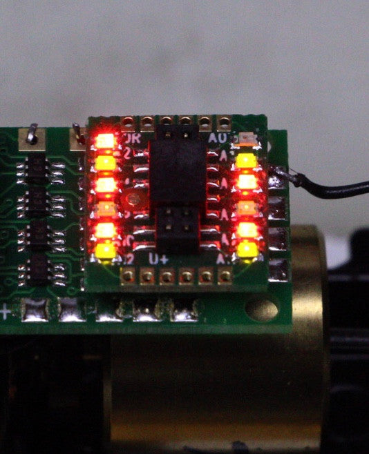 With the abundance of lighting functions and wanting to see and check them before I placed the shell on the frame, I decided I needed a way to see what was happening! I went to work and prototyped a small connector board with LEDs so I could put the frame on the test track and test the motor, speaker and lighting functions before assembling the locomotive. The Light Test Board is also a good diagnostic tool to see if the decoder and motherboard are behaving properly!