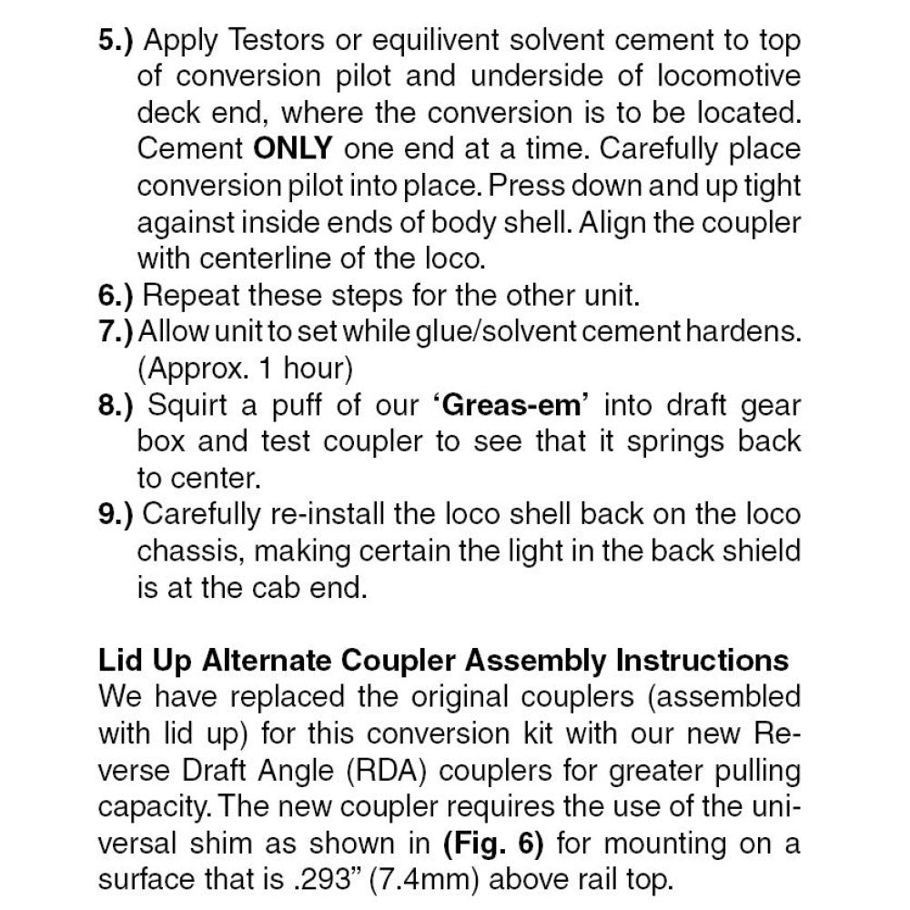 N Scale Package includes one front and one rear coupler. This conversion fits: Kato: U30C Diesel Locomotives. Kit includes two assembled 1015 RDA couplers w/universal shim & draft gear. Two conversion pilots & three 00-90 screws.