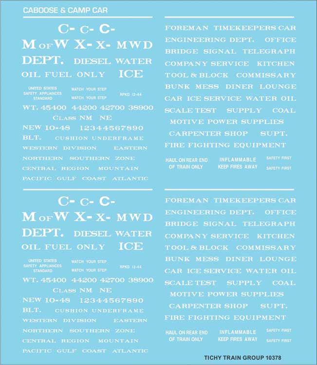 Tichy Train Group 10378 Railroad Decal Set -- Maintenance-of-Way and Camp Car Data (white lettering) HO Scale is backordered and will ship as soon as it is back in stock.