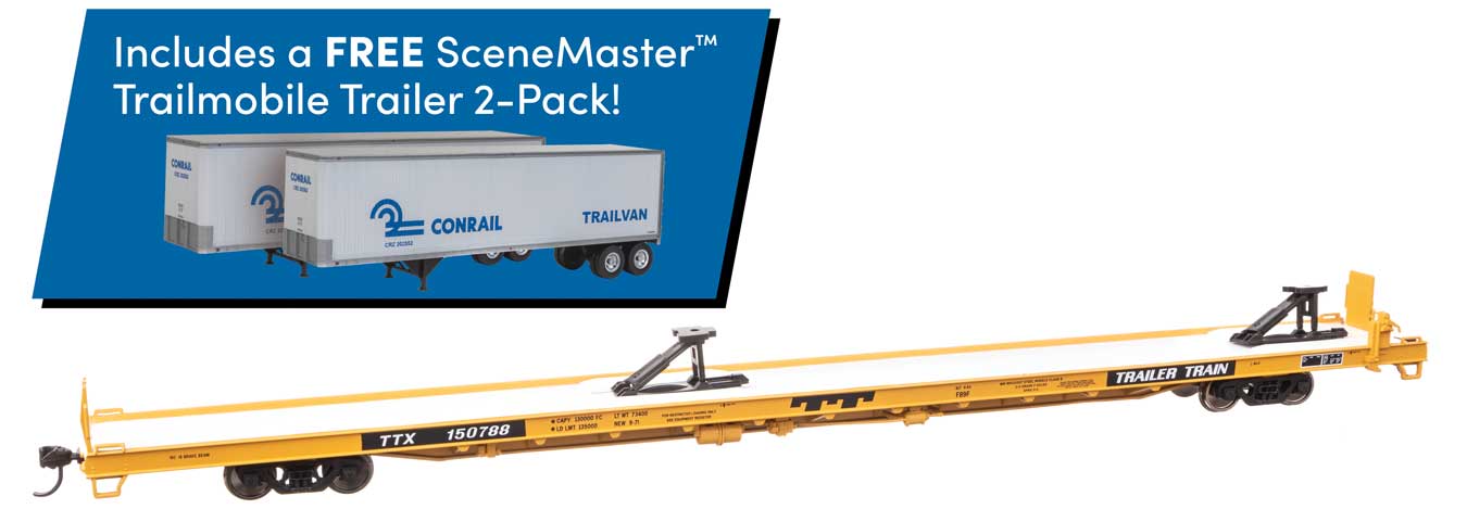 Walthers 5738B 89' Channel Side Flatcar w/2 Trailmobile Trailers - Ready to Run -- Trailer-Train TTX #150788 (yellow, black; Conrail Trailers) HO Scale is backordered and will ship as soon as it is back in stock.