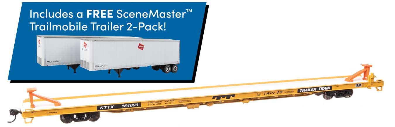 Walthers 5742B 89' Channel Side Flatcar w/2 Trailmobile Trailers - Ready to Run -- Trailer-Train KTTX #154003 (yellow, black; Milwaukee Trailers) HO Scale is backordered and will ship as soon as it is back in stock.