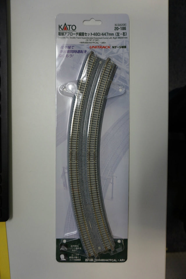 Kato 20-186 Unitrack 480mm/447mm Radius 22.5º (18 7/8" - 17 5/8") CT Double Track Easement Curve Track Right and Left; N Scale, 20186 is backordered and will ship as soon as it is back in stock.