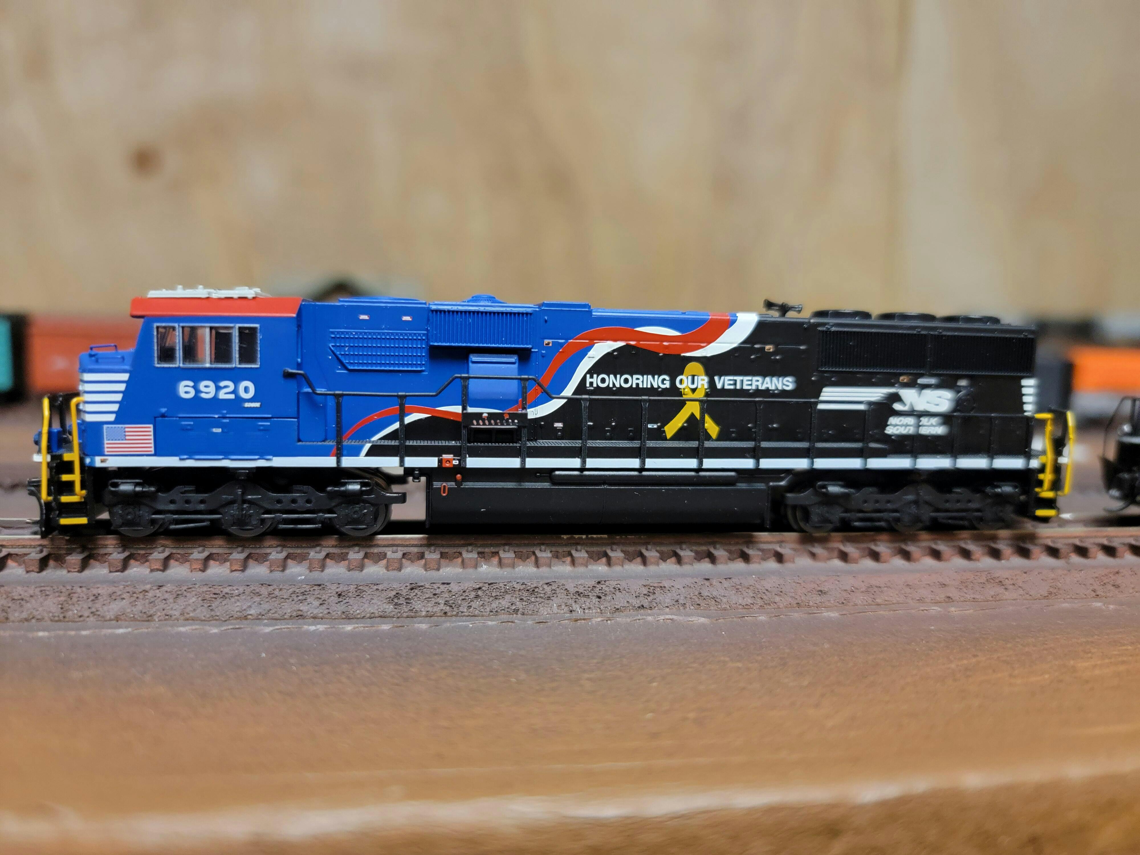 In the late 2000’s, Norfolk Southern looked for ways to increase the life of their SD60 fleet. One factor NS had for them was their venerable Juniata Locomotive Shop in Altoona, Pa, which has the ability and a proven history of rebuilding just about any type of locomotive. Enter the “SD60E”, which would take SD60 cores (The first 240 planned would be from standard cab SD60’s, which was a mixture of NS and former lease locomotives) and add a new cab designed by NS, which was called a “Crescent Cab”. The locomotive received upgrades to the motor, fuel tank (On earlier rebuilds), and microprocessor controls to name a few. The first SD60E rolled out in 2010 as number 6900, which was rebuilt from NS 6653. Soon, more would follow and the current totals are at 136 rebuilt so far (NS 6900-7035). More rebuilds are planned into 2019 and eventually their SD60M and SD60I fleet will be rebuilt. What makes the SD60E even more unique from their browed cabs, is that three locomotives wear commemorative schemes honoring, Veterans, First Responders, and the “GORAIL” project. Atlas’ representation captures every detail, right down to the PTC Antenna Array on top of the cab roof.
