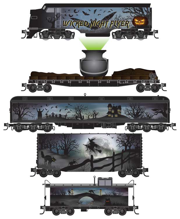 Wicked Night Flyer Halloween Train-Only Set - Standard DC -- EMD FT-A Diesel, Flatcar with Cauldron Load, Boxcar, Passenger Car, Caboose