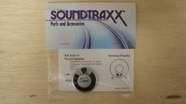 810114 Soundtraxx / 30mm Round, 8 Ohm Speaker SPEA (SCALE=ALL) Part # = 678-810114 is backordered and will ship as soon as it is back in stock.