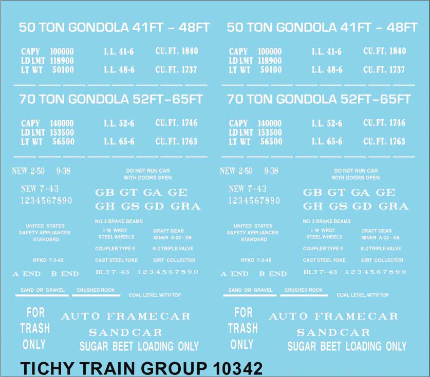 Tichy Train Group 10342N Railroad Decal Set -- Generic 41', 48', 52 and 64 Steel Gondola Data (white lettering) N Scale is backordered and will ship as soon as it is back in stock.