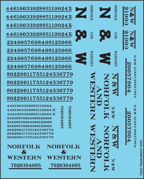 Tichy Train Group 10431 Railroad Decal Set -- Norfolk & Western Roadname Set (black) HO Scale is backordered and will ship as soon as it is back in stock.