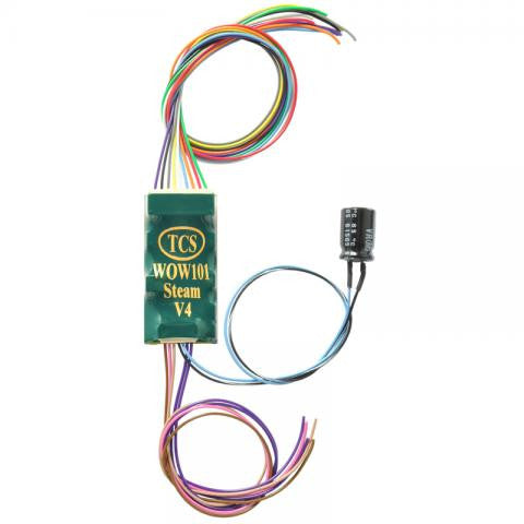 The WOW101 is a universal decoder for locomotives with DCC-ready 9-pin plugs, or locomotives which cannot accommodate a motherboard or WOWKit. This decoder may be hard-wired or plugged directly into any locomotive with a 9-pin JST plug. The WOW101 is compatible with any T-Series harness, and also includes an auxiliary harness for attaching your speaker, CAM, Keep Alive®, and for the additional lighting functions (F3 and F4).