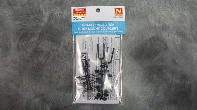 00102000 MICRO TRAINS / 001 02 000 UNASSEMBLED RDA BODY MOUNT COUPLERS (1015/1016) 3 PAIR is backordered and will ship as soon as it is back in stock.