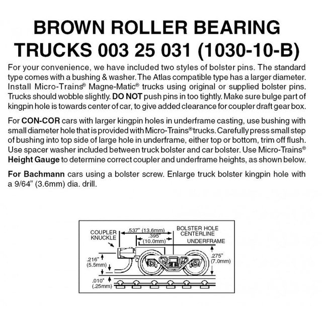 00312531 MICRO TRAINS / 003 25 031 ROLLER BEARING TRUCKS (1030-10-B) (SCALE=N) is backordered and will ship as soon as it is back in stock.