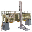 Often surplus freight cars live on, avoiding the scrapper. Flat cars are used as bridges, boxcars as storage containers, and covered hoppers for storage of feed and grain across the country. Generally these are elevated so that trucks can drive below and be loaded for deliveries on the farm or elsewhere. Our model represents one such example, an old weather beaten hopper placed on concrete bases and fed by small vertical conveyors filling them for storage.