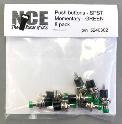 302 NCE / 8 pack N.O. Momentary SPST Pushbutton Green (SCALE=ALL) Part # 524-302 is backordered and will ship as soon as it is back in stock.