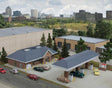 Assembled models measure: Main Building: 5-3/4 x 3-5/8 x 1-3/4" 14.6 x 9.2 x 4.4cm Auto Island: 6 x 1-7/8 x 2" 15.2 x 4.7 x 5cm Parking Lot - each section: 5-3/4 x 2-7/8 x .050" 14.6 x 7.3 x 0.127cm